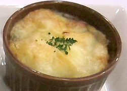 5.餅を軽く茹で、片栗粉をまぶし麺棒でのばす。器のふちに卵黄を塗り、のばした餅を貼り付ける。餅に卵黄を塗り、200℃のオーブンで5〜6分焼く。 |